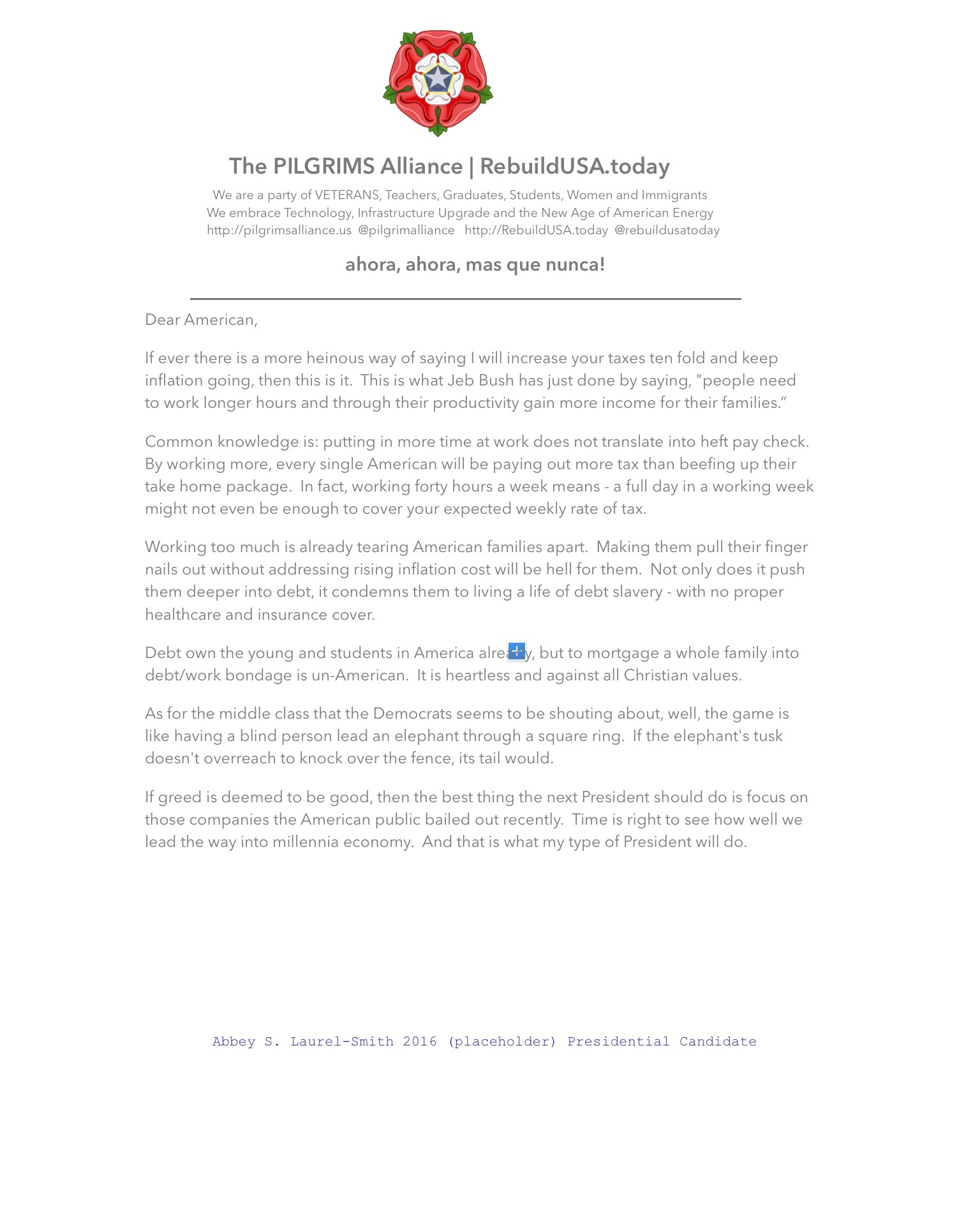 Well my dear #Americans, this is the millennia and if ever there is a more heinous way of saying I will increase your taxes ten fold and keep inflation going, then this is it. This is what Jeb Bush has just done by saying, “people need to work longer hours and through their productivity gain more income for their families.”