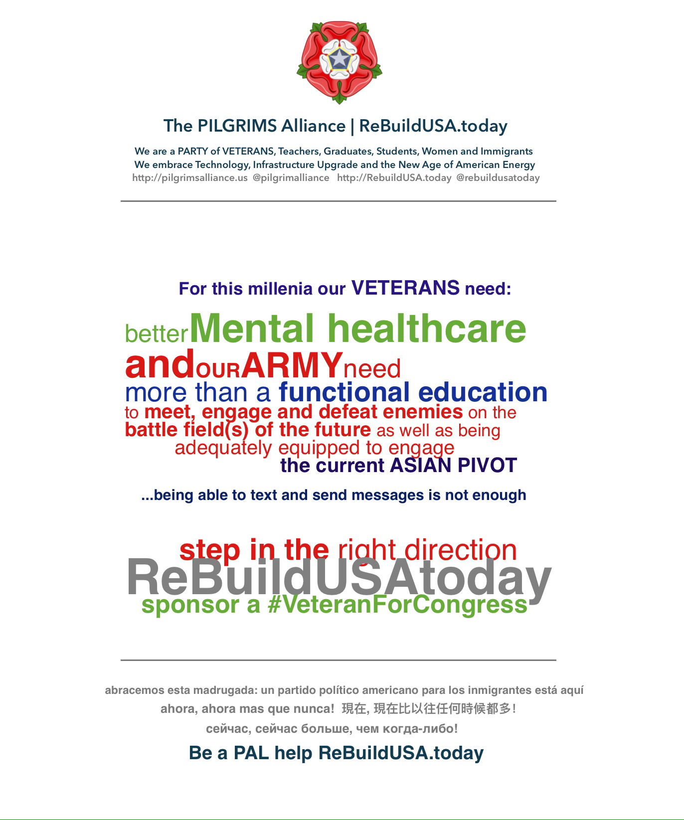 Join the Pilgrims Alliance to improve the military, it’s standard and Veterans’ education at all level. Let’s all campaign to ReBuildUSAtoday.