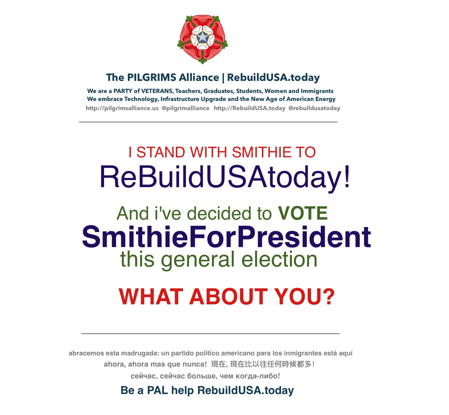 For more information about Smithie, please visit rebuildusa.today, The PILGRIMS Alliance Party of America and “I stand with SMITHIE” – SmithieForPresident and Veterans’ talkback