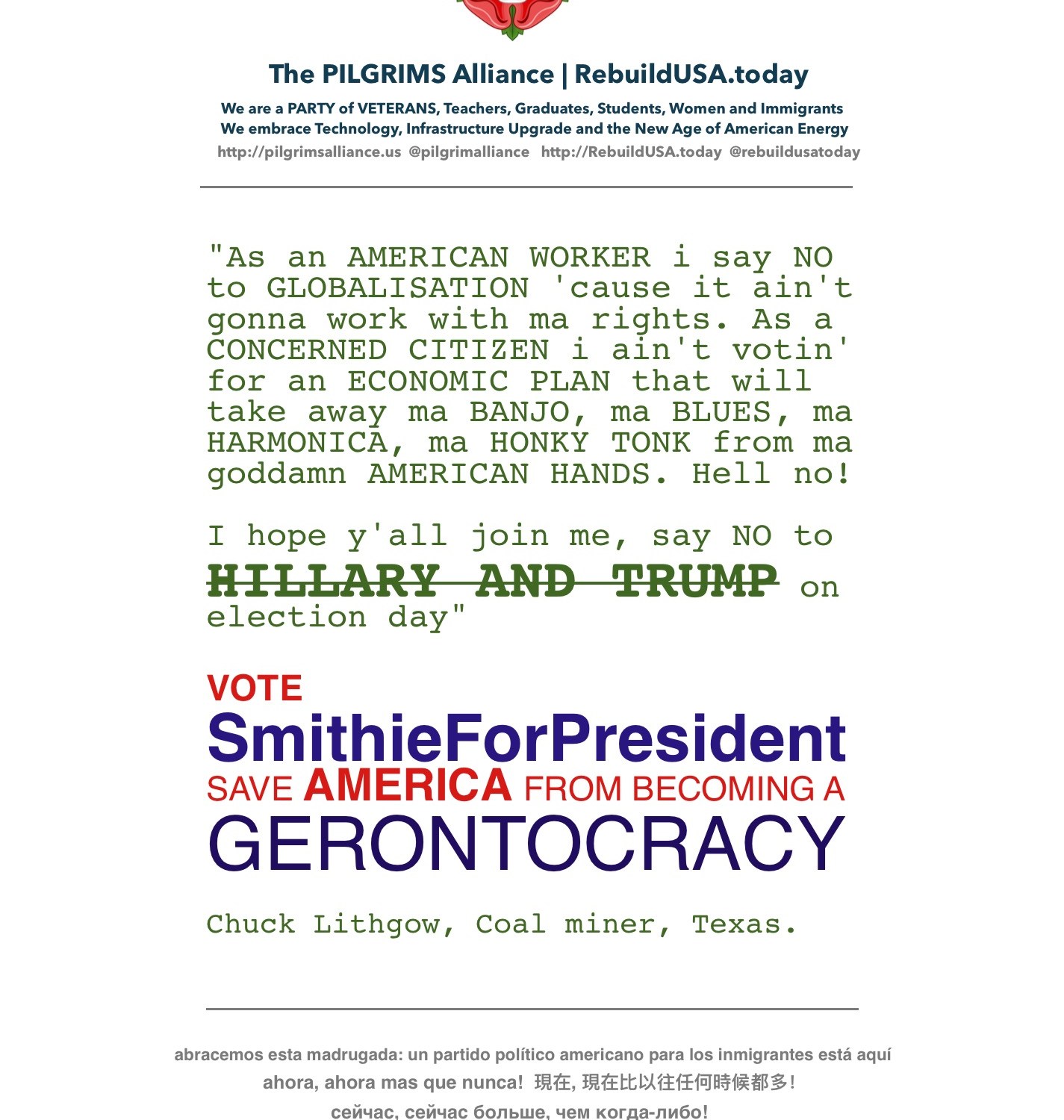 I ain’t gonna vote for Hillary or Trump to come take away ma banjo and ma blues away with that kind of global economic plan. Hell no!…” So said Chuck Lithgow, a coal miner from the state of Texas.